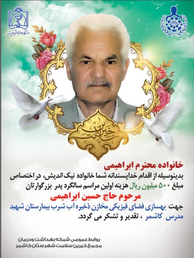 دکتر حسن مکارم گفت: خانواده خیر اندیش ابراهیمی در اولین سالگرد درگذشت پدر بزرگوارشان شادروان حاج محمد حسین ابراهیمی در اقدامی خداپسندانه ۵۰۰میلیون ریال به حوزه سلامت شهرستان کمک نمودند.
