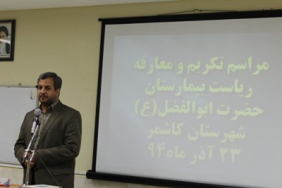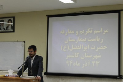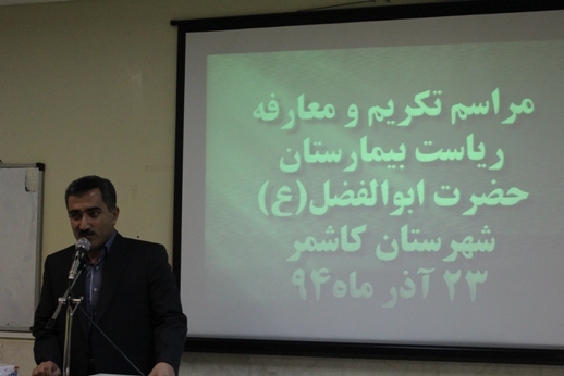 مدیر شبکه بهداشت و درمان شهرستان کاشمر در ادامه دکتر محمد رضا رضانژاد را را به عنوان سرپرست سرپرست بیمارستان حضرت ابوالفضل (ع) کاشمر معرفی و برای وی نیز آرزوی موفقیت در این سمت نمود.
