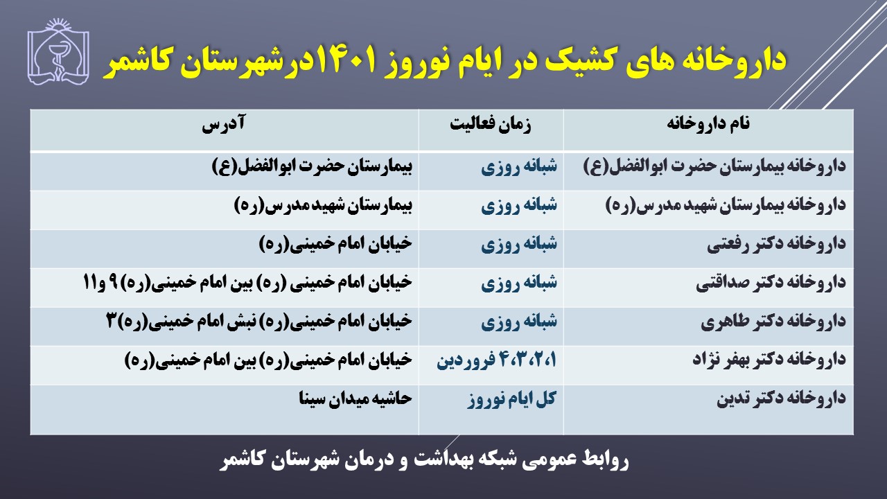 افشار امير اخبار 28 اسفند 1400 بازدید: 151 امتیاز: ( 0 Rating ) داروخانه های کشیک در ایام نوروز1401 امتیاز کاربران لطفا رای دهید رای 1 رای 2 رای 3 رای 4 رای 5 قبلی بعدی