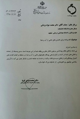 رییس مرکز مدیریت بیماری های واگیر وزارت بهداشت و درمان و آموزش پزشکی با ارسال نامه ای از تلاش های دکتر محمد جواد یزدانی مدیر شبکه بهداشت و درمان و رئیس مجتمع آموزش عالی سلامت شهرستان کاشمر در اجرای برنامه های پیشگیرانه قدردانی نمود.